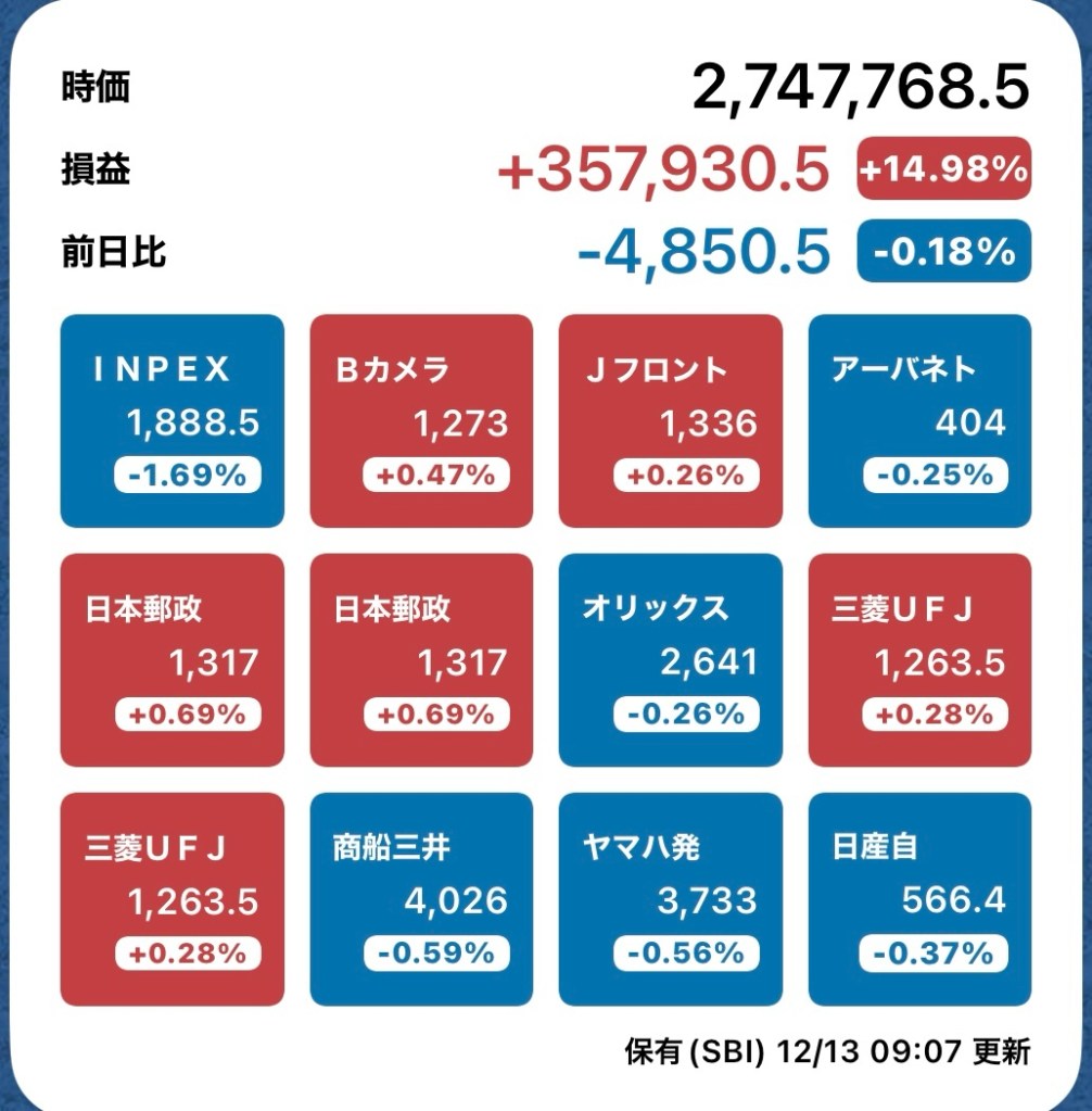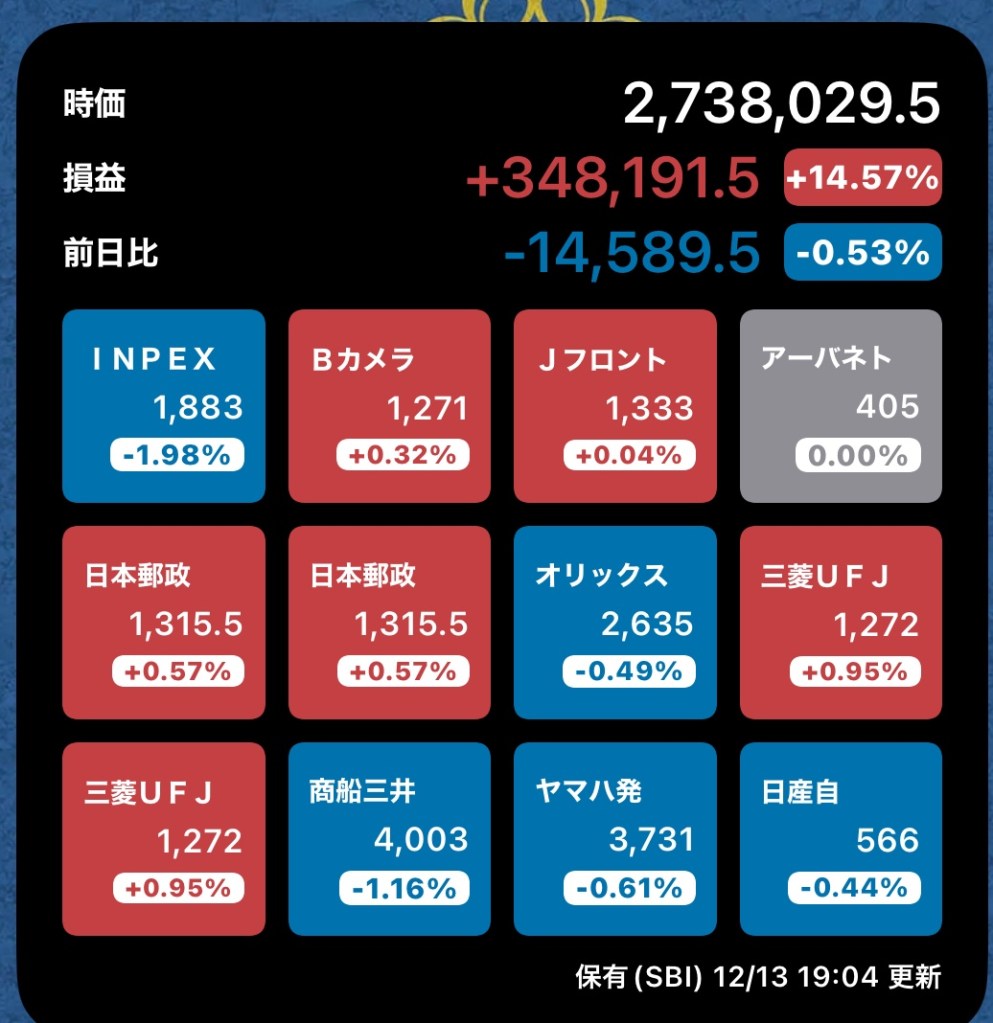 株メモ20231213 投稿者:volumeV62023年12月13日カテゴリー:未分類 ぼちぼち下がってます。全体でマイナスにならない限りはこのまま放置で行きますよ! 共有: X で共有 (新しいウィンドウで開きます) X Facebook で共有 (新しいウィンドウで開きます) Facebook いいね 読み込み中…