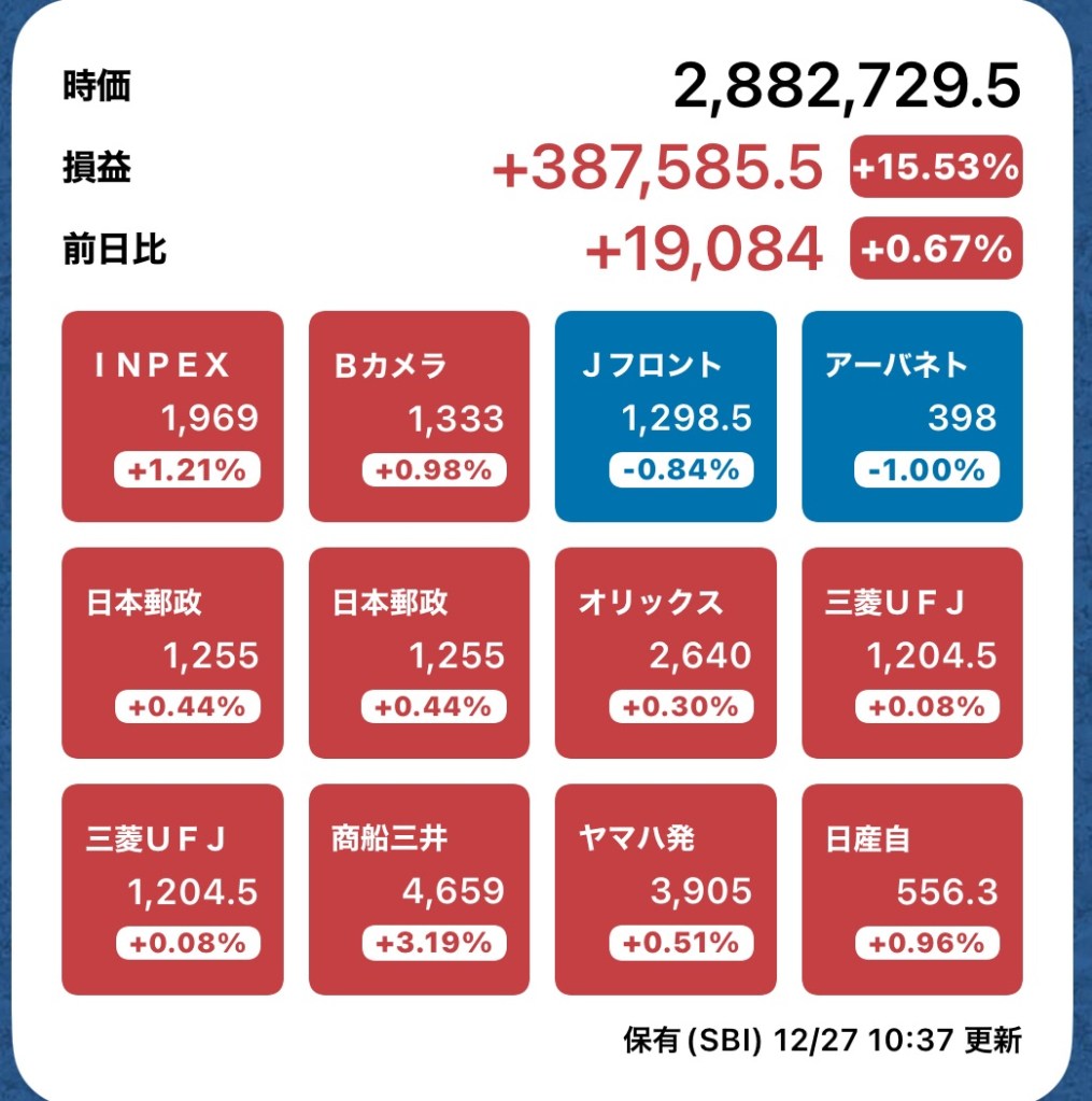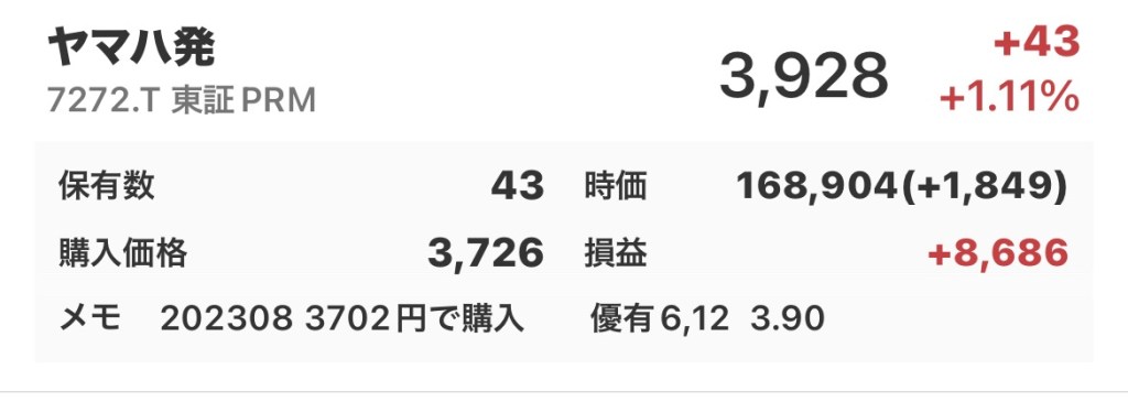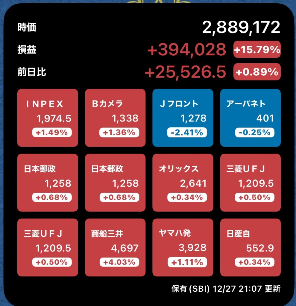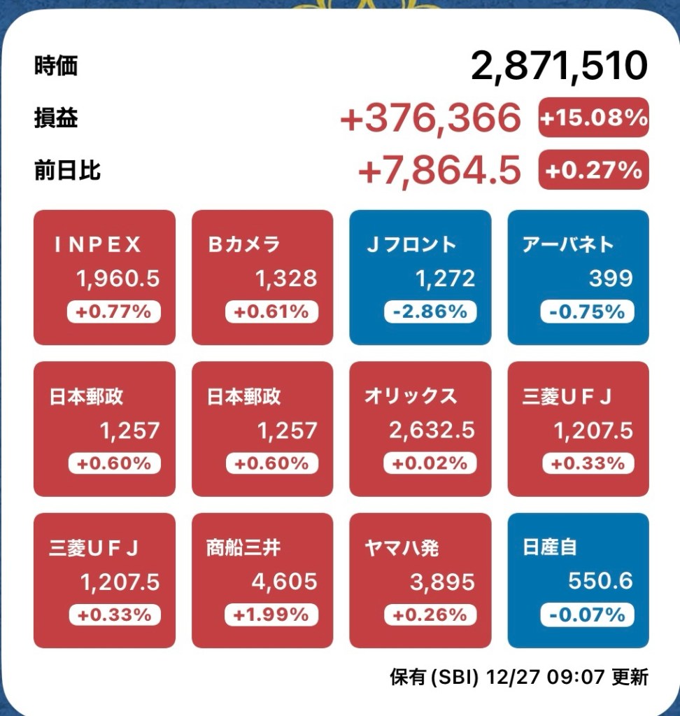 株メモ20231227 投稿者:volumeV62023年12月27日2023年12月27日カテゴリー:株タグ:#投資 #株 #決算日 #株主 #株主優待 #SBI証券 おはようございます!今日で仕事納めー!そして権利確定日ですね! 本日のモーサテメモ 半導体の新組織「ASURA」・トヨタ・日産・マツダ ・パナソニック ・DENSO 本日のS株 分割前のヤマハ発動機 共有: X で共有 (新しいウィンドウで開きます) X Facebook で共有 (新しいウィンドウで開きます) Facebook いいね 読み込み中…