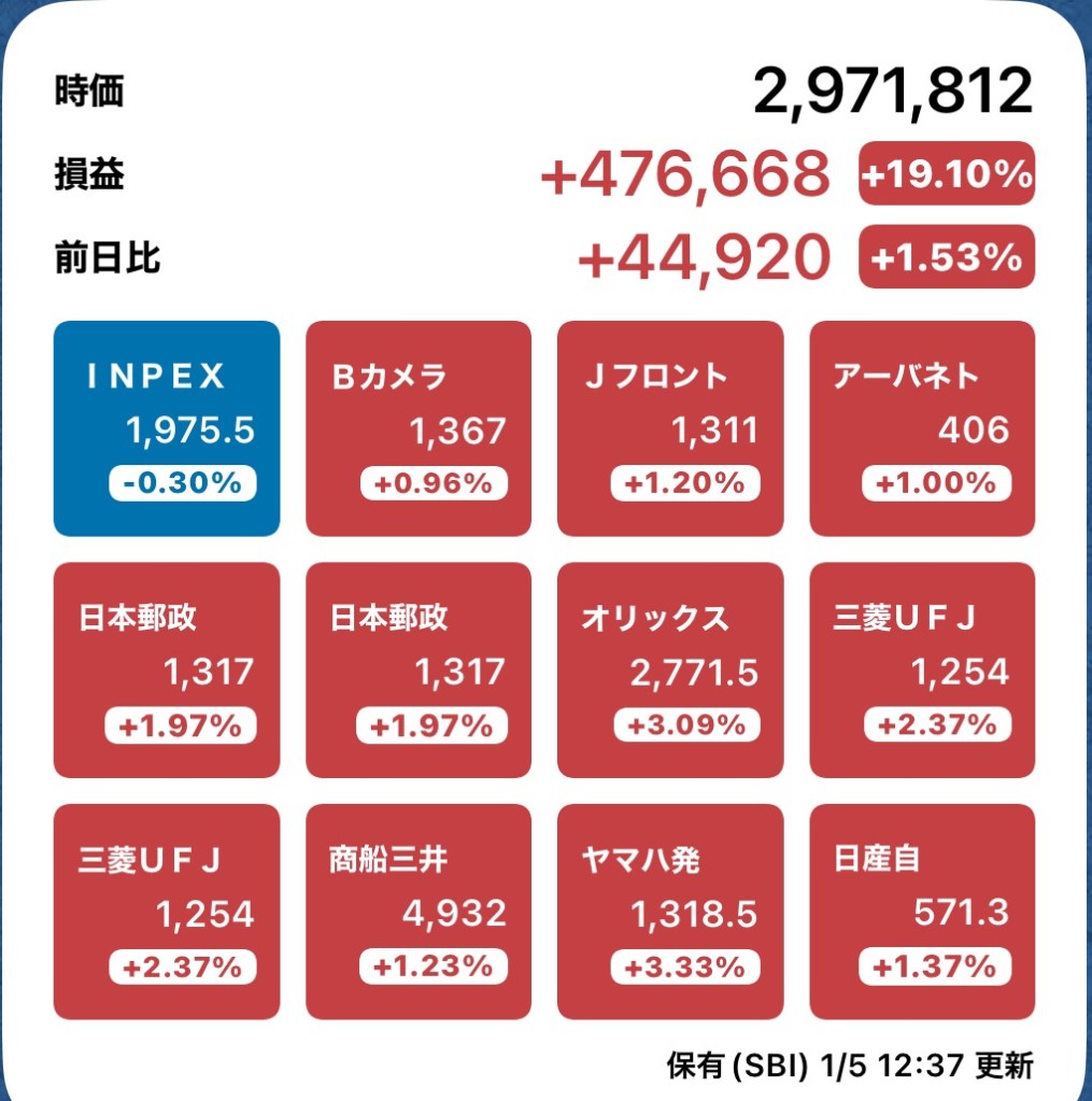株メモ20240105 投稿者:volumeV62024年1月5日2024年1月5日カテゴリー:株タグ:#投資 #株 #決算日 #株主 #株主優待 #SBI証券 昨日がすごかったので今日はガクッとくるかと思いきや、今日は上がってます。 やっぱり災害が影響してるのかな。 共有: X で共有 (新しいウィンドウで開きます) X Facebook で共有 (新しいウィンドウで開きます) Facebook いいね 読み込み中…