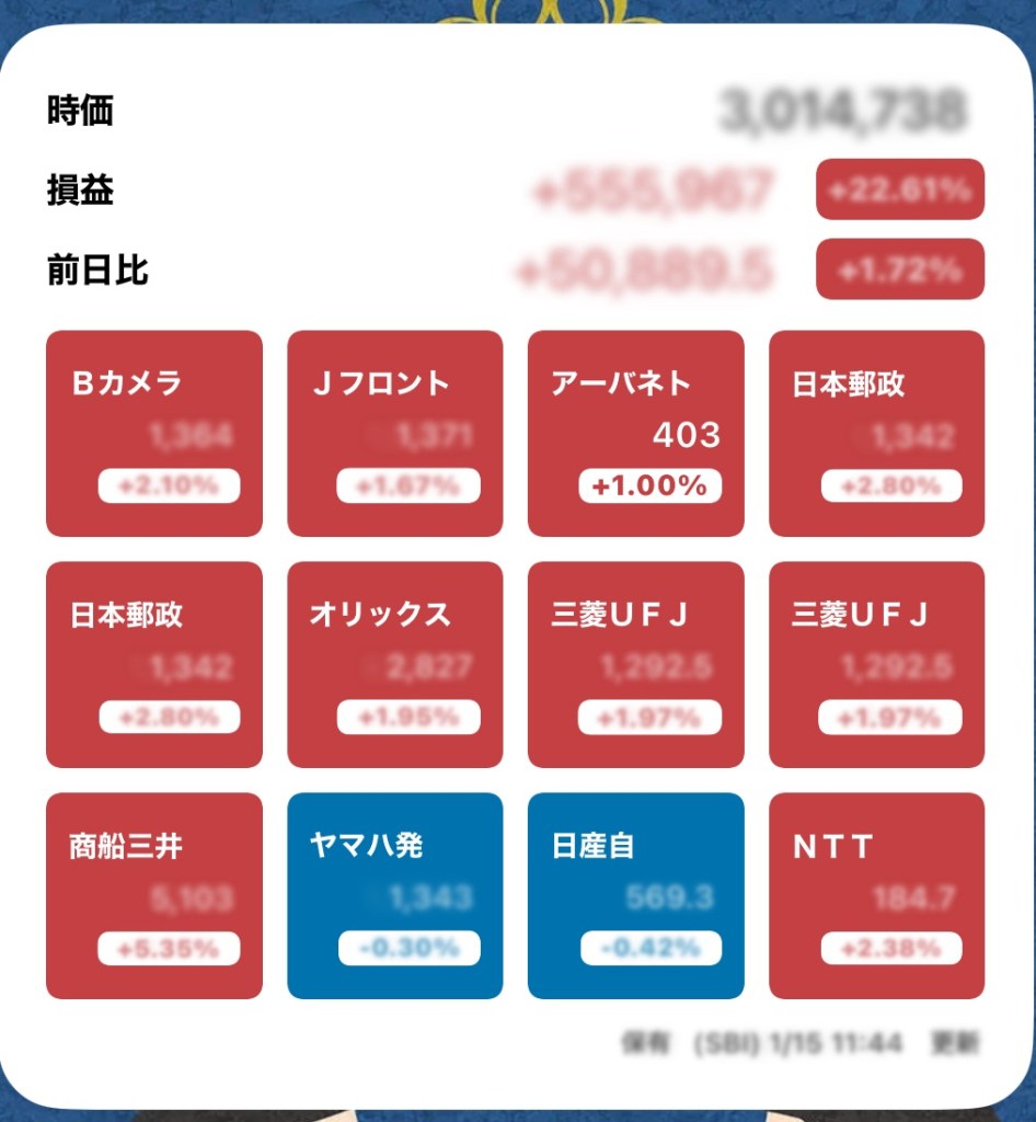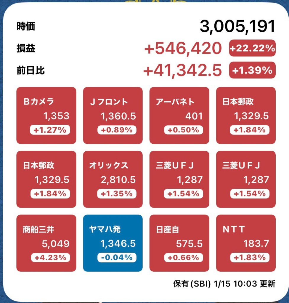株メモ20240115(最高額更新) 投稿者:volumeV62024年1月15日カテゴリー:株タグ:#投資 #株 #決算日 #株主 #株主優待 #SBI証券 日経がとうとう36000円! いや、逆に怖いわ💦 うちのPFもみたことない数字に… この後下がるなら、記念写真撮っておこう💦 ボケてるけど、これが最高額(笑) これが現物ならな〜。 配当欲しいから売りたくないけど、2月がどうなるかっ! 共有: X で共有 (新しいウィンドウで開きます) X Facebook で共有 (新しいウィンドウで開きます) Facebook いいね 読み込み中…