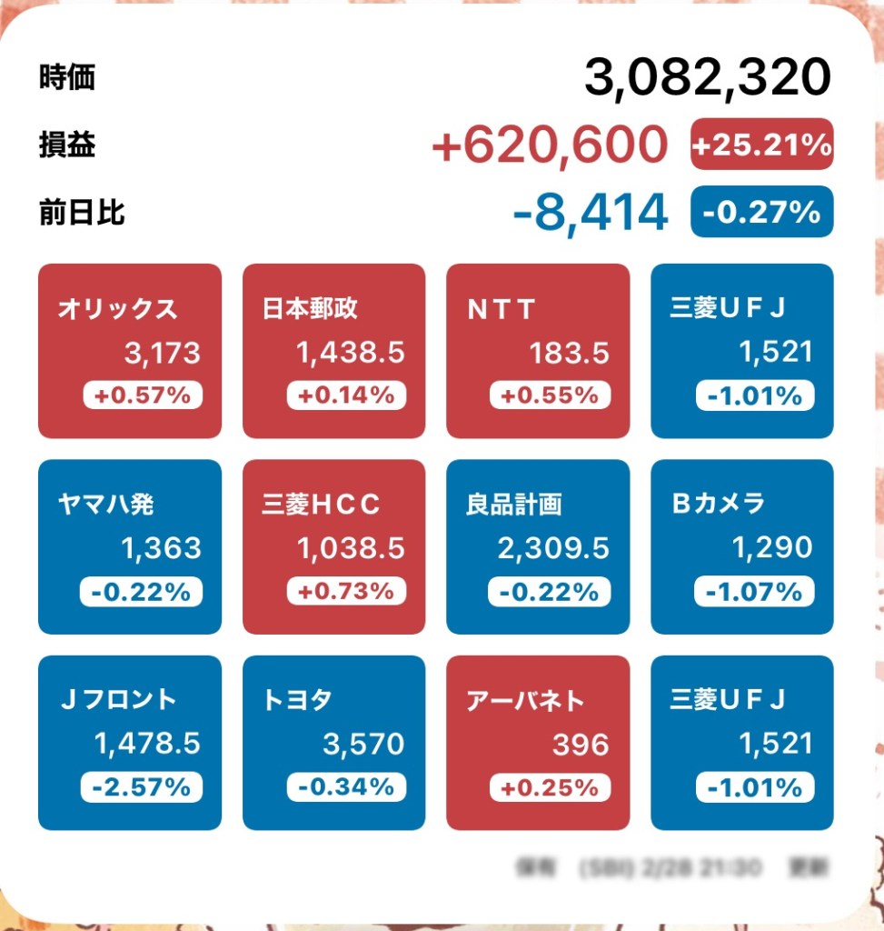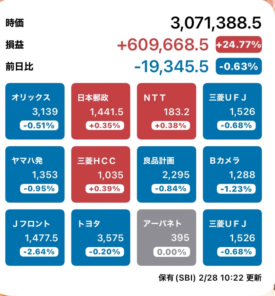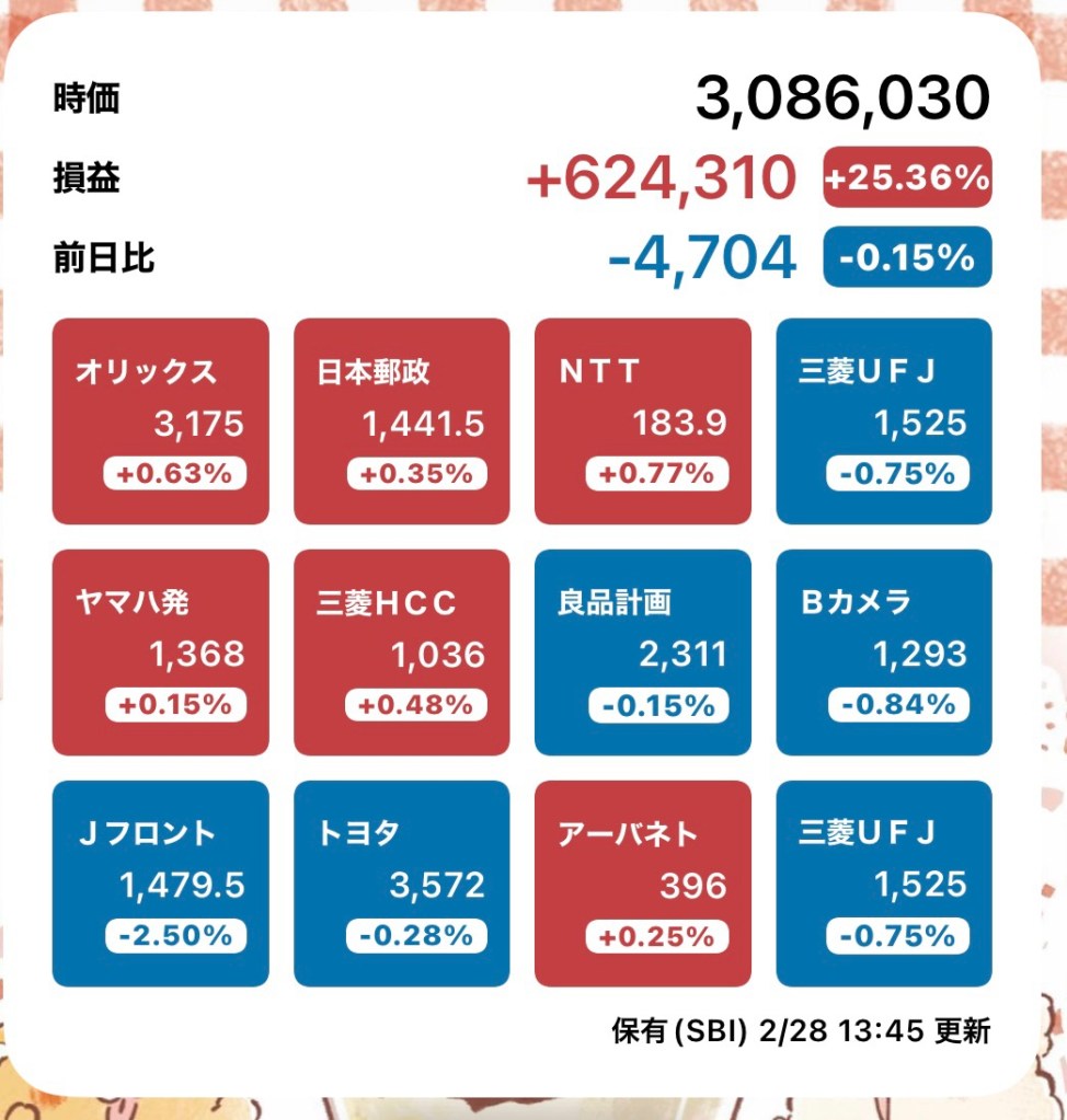 株メモ20240228 投稿者:volumeV62024年2月28日2025年5月30日カテゴリー:株タグ:#投資 #株 #決算日 #株主 #株主優待 #SBI証券 おはようございます! 昨日信用で買った三井E&FのPTSがプラ転してる…! でも、PTSはあくまで指標。前場寄りでどどーんと↑か↓か? 日経平均月末はオシメの傾向?年度末が更に顕著に出る@モーサテ ノババックス・セールスフォースが決算。要チェック。 共有: X で共有 (新しいウィンドウで開きます) X Facebook で共有 (新しいウィンドウで開きます) Facebook いいね 読み込み中…