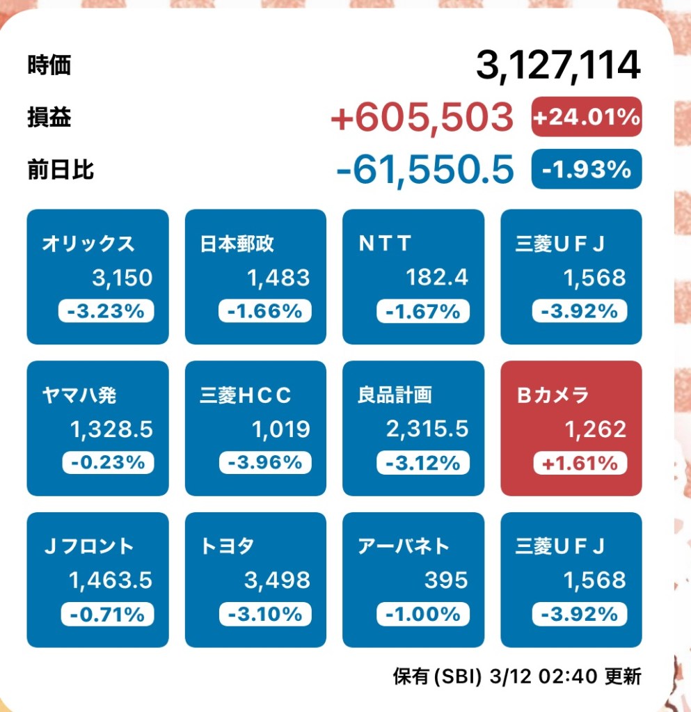 株メモ20240312 投稿者:volumeV62024年3月12日2024年3月12日カテゴリー:株タグ:#投資 #株 #決算日 #株主 #株主優待 #SBI証券 昨日に引き続き、どちらかというと下降気味。 昨日信用で買ったわかもととみずほは損切りしました💦 やっぱり三井E&Sはビギナーズラックだったかなぁ😅 いやいや、そうならないようにしないとな😎 あれ?更新されてない?? たまたま見つけたけど、下のカープ、乖離率の目の付け所かな? 共有: X で共有 (新しいウィンドウで開きます) X Facebook で共有 (新しいウィンドウで開きます) Facebook いいね 読み込み中…