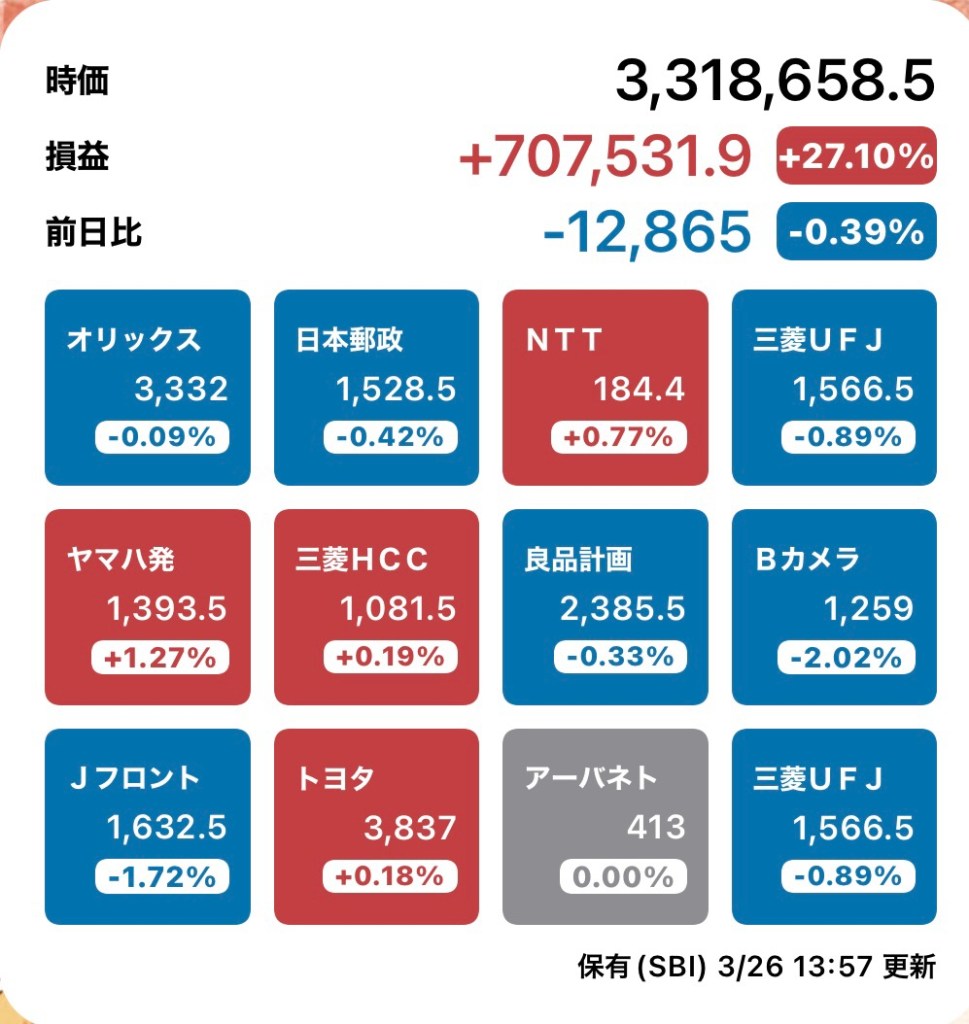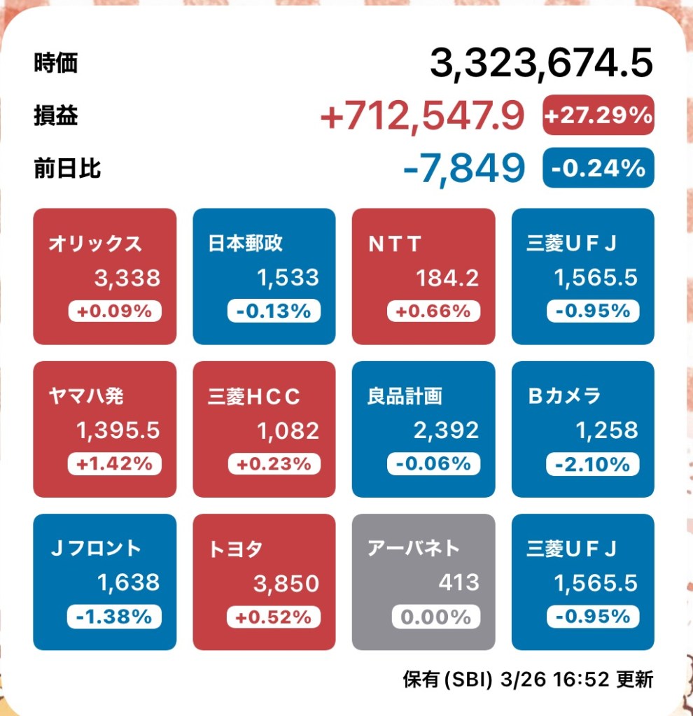 株メモ20240326 投稿者:volumeV62024年3月27日カテゴリー:未分類タグ:#投資 #株 #決算日 #株主 #株主優待 #SBI証券 優待権利日明日なのに、この下げは何?? 明日ジャンプへの屈伸なの?? 東急不動産とJフロントでみたけと 共有: X で共有 (新しいウィンドウで開きます) X Facebook で共有 (新しいウィンドウで開きます) Facebook いいね 読み込み中…