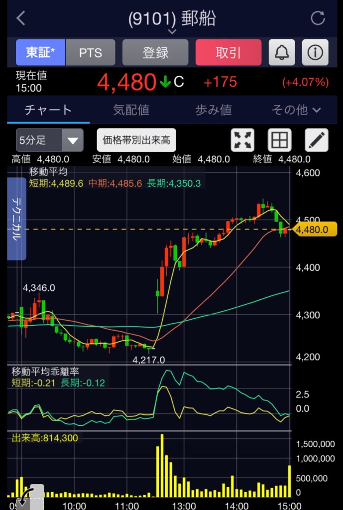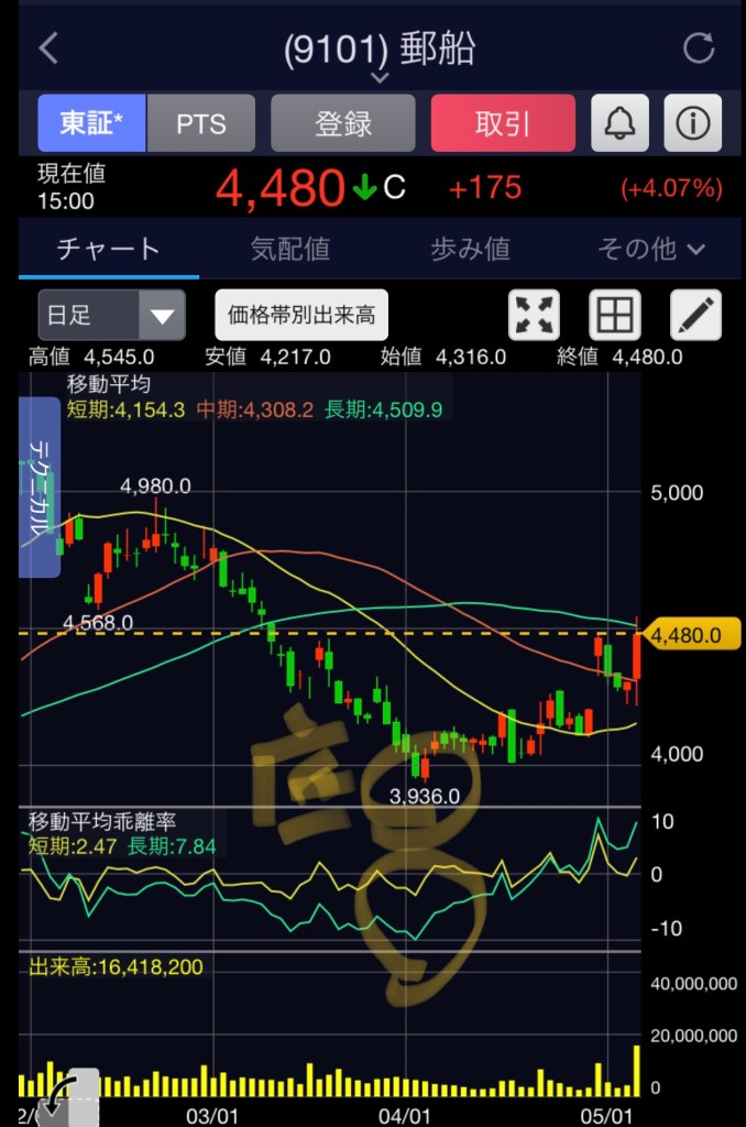 ちなみに、今日の勝ちは郵船。