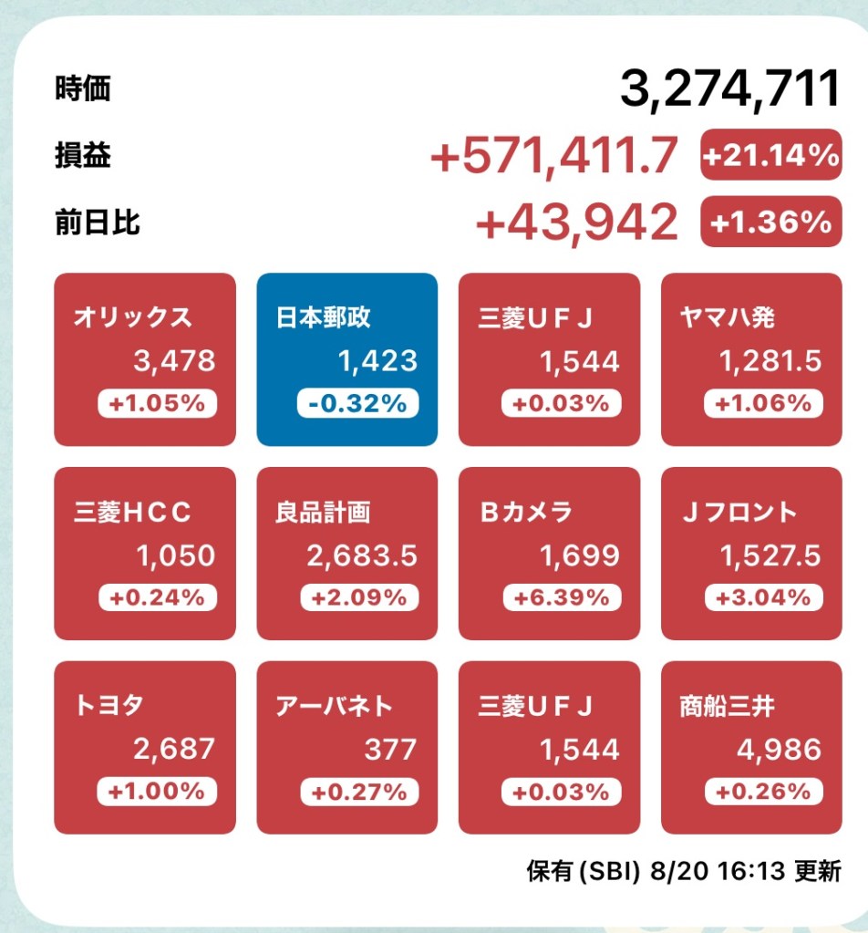 株メモ20240820 投稿者:volumeV62024年8月20日カテゴリー:株タグ:#投資 #株 #決算日 #株主 #株主優待 #SBI証券 今日は強かったですねー! 私は朝から皮膚科に行ってましたが。 健康大事です。 そんな今日のPF 以下は雑誌ダイヤモンドで見つけた切り抜き。 共有: X で共有 (新しいウィンドウで開きます) X Facebook で共有 (新しいウィンドウで開きます) Facebook いいね 読み込み中…