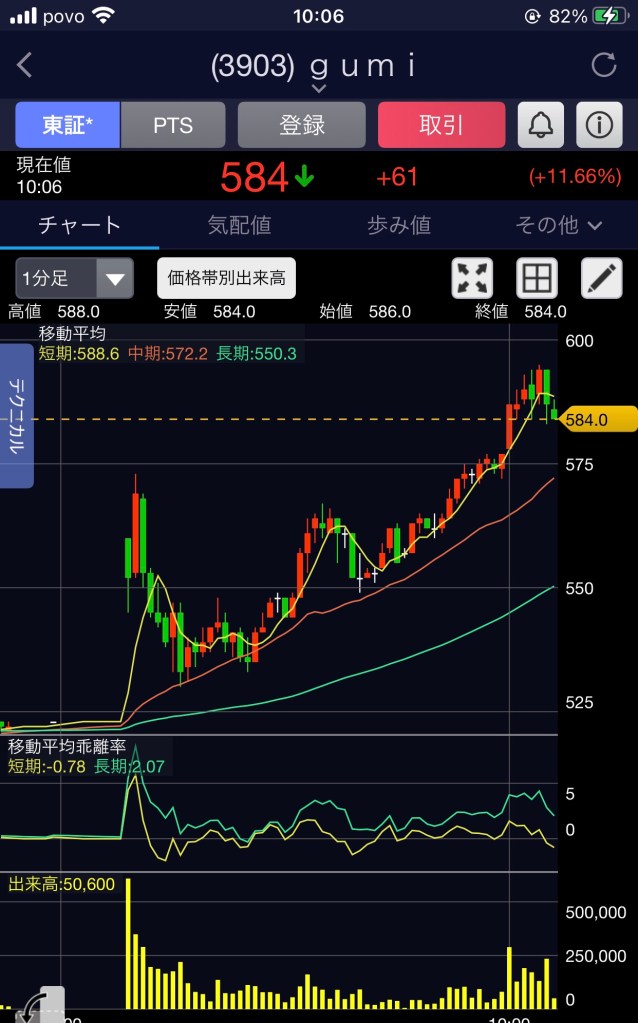 株メモ20250313 投稿者:volumeV62025年3月13日カテゴリー:未分類 今日もちょこっと。 掃除終わって9:15過ぎてたんだけど、gumiがいい感じだったので参戦。 +500円でした。 高値ブレイクで592まで行ったので、チキンでなければ3000円行ってたな💦まだまだ修行。 共有: X で共有 (新しいウィンドウで開きます) X Facebook で共有 (新しいウィンドウで開きます) Facebook いいね 読み込み中…