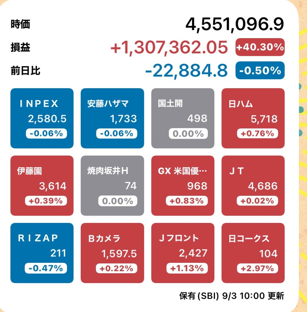 株メモ20250903 投稿者:volumeV62025年9月3日カテゴリー:株タグ:#投資 #株 #決算日 #株主 #株主優待 #SBI証券 手元にお金がないのよね。 株のお知らせはどんどん届いてます! 共有: X で共有 (新しいウィンドウで開きます) X Facebook で共有 (新しいウィンドウで開きます) Facebook いいね 読み込み中…