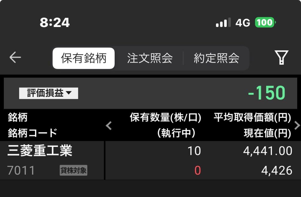 お昼にすぐ三菱重工買ったけど、午後下がってどうなるか…?