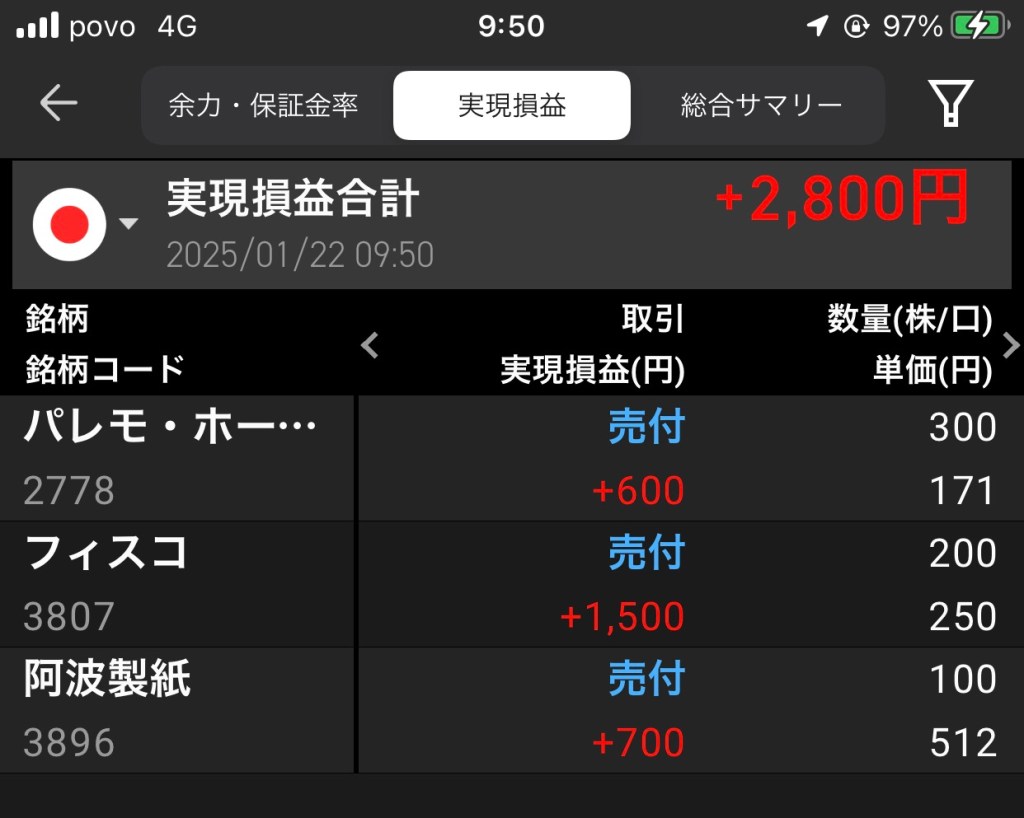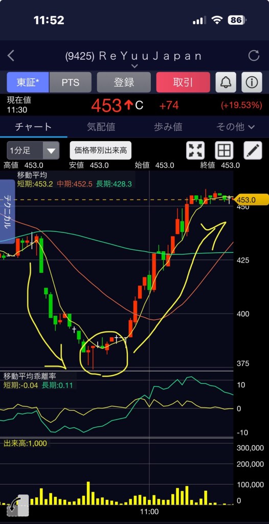 ReYuuJapanは、一旦S高でも指値で約定できず、一旦379まで落ちたから損切り覚悟したけど(1万円😱)、先日の教訓から、S高目指しはリバウンドあり、で待ってたら再チャレンジ来た!!ヽ(゚ー゚*ヽ)ヽ(*゚ー゚*)ノ(ノ*゚ー゚)ノ ヒューイ♪ヒューイ♪