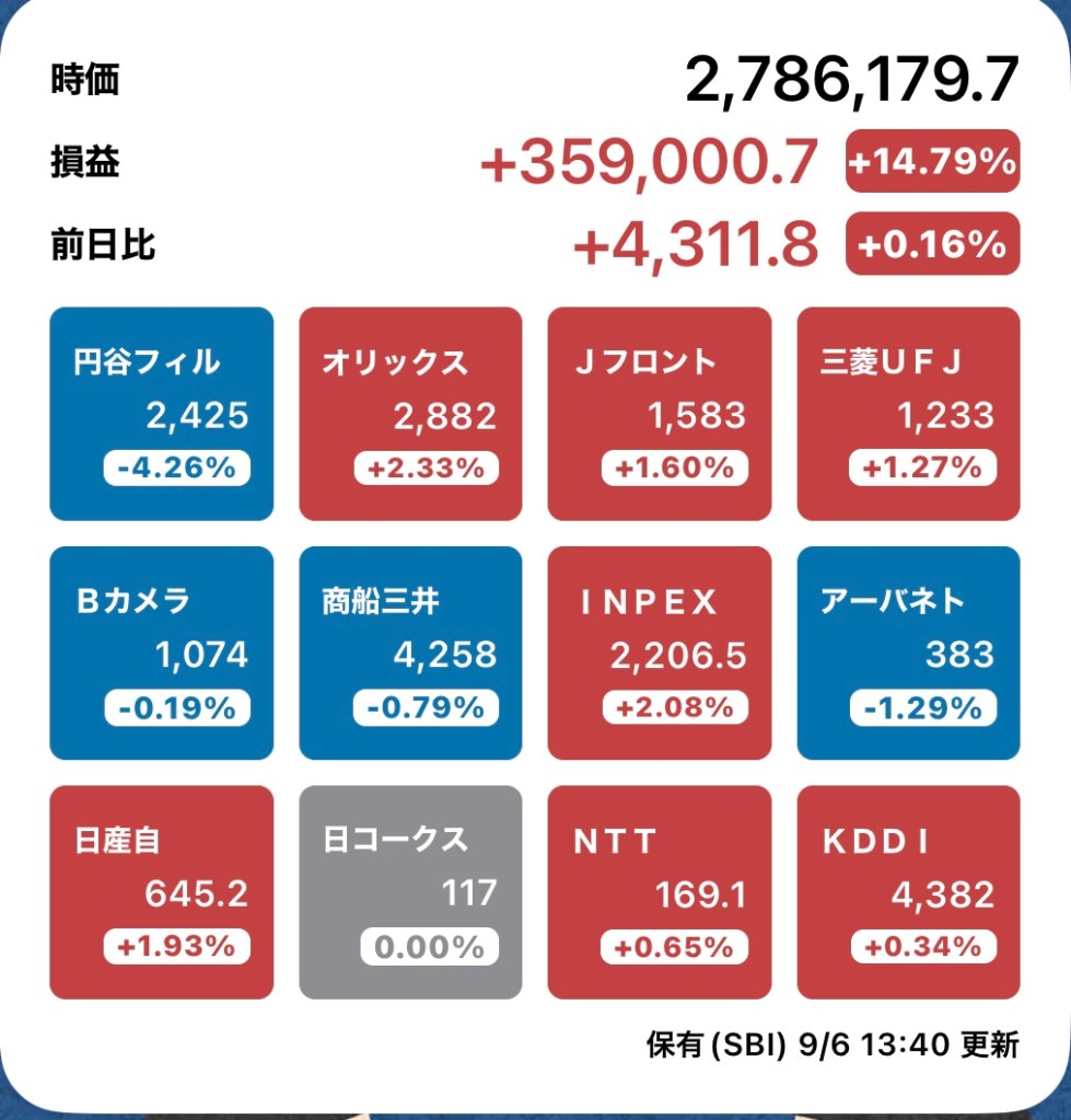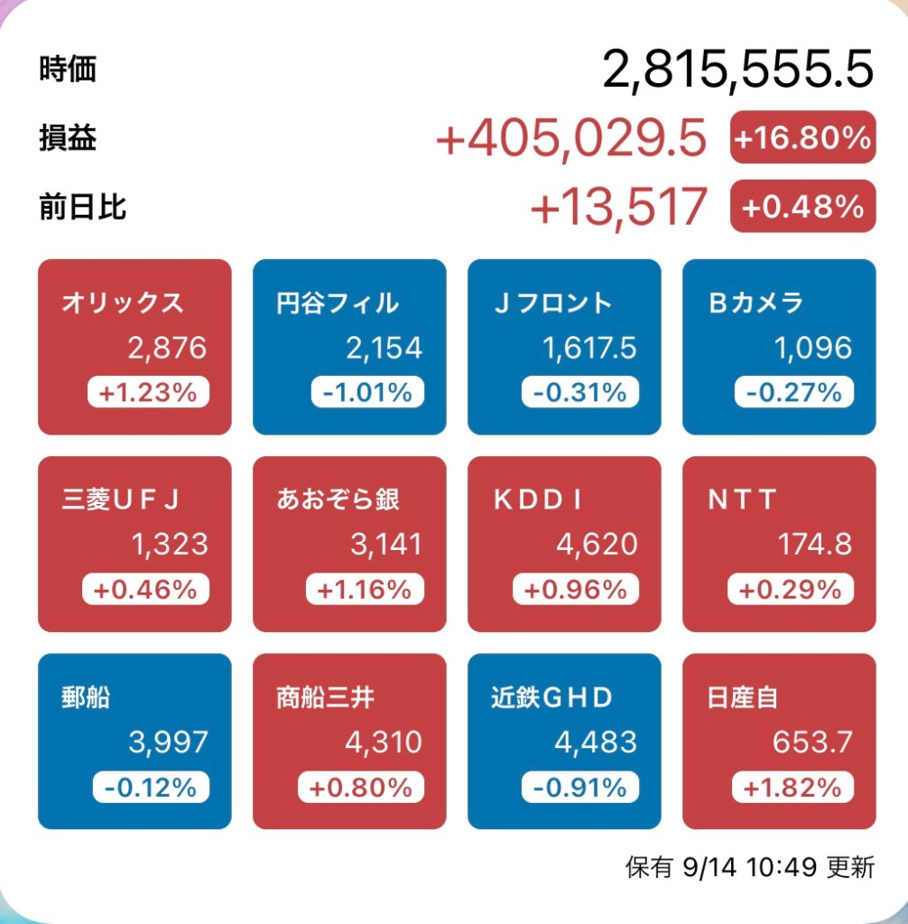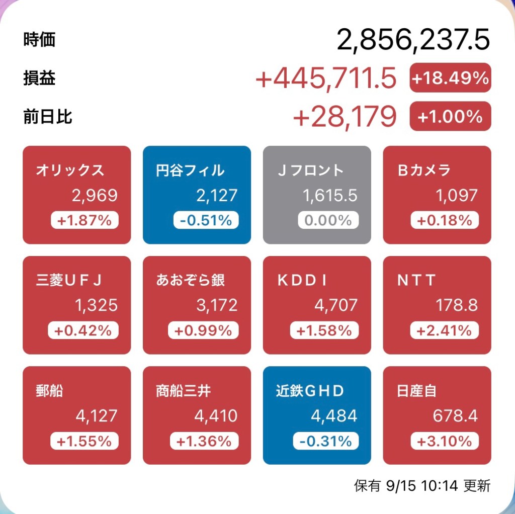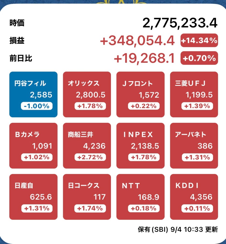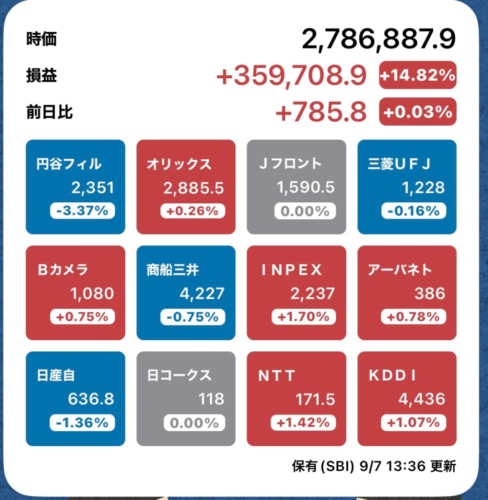 さて、私の方はというと。今日もお休みですが、朝から病院周りです。最初の整形外科行ったときからぐんぐん↑の日経と私のPF…夏枯れ過ぎて、秋のアップが続くのか?!?