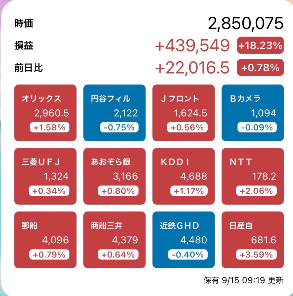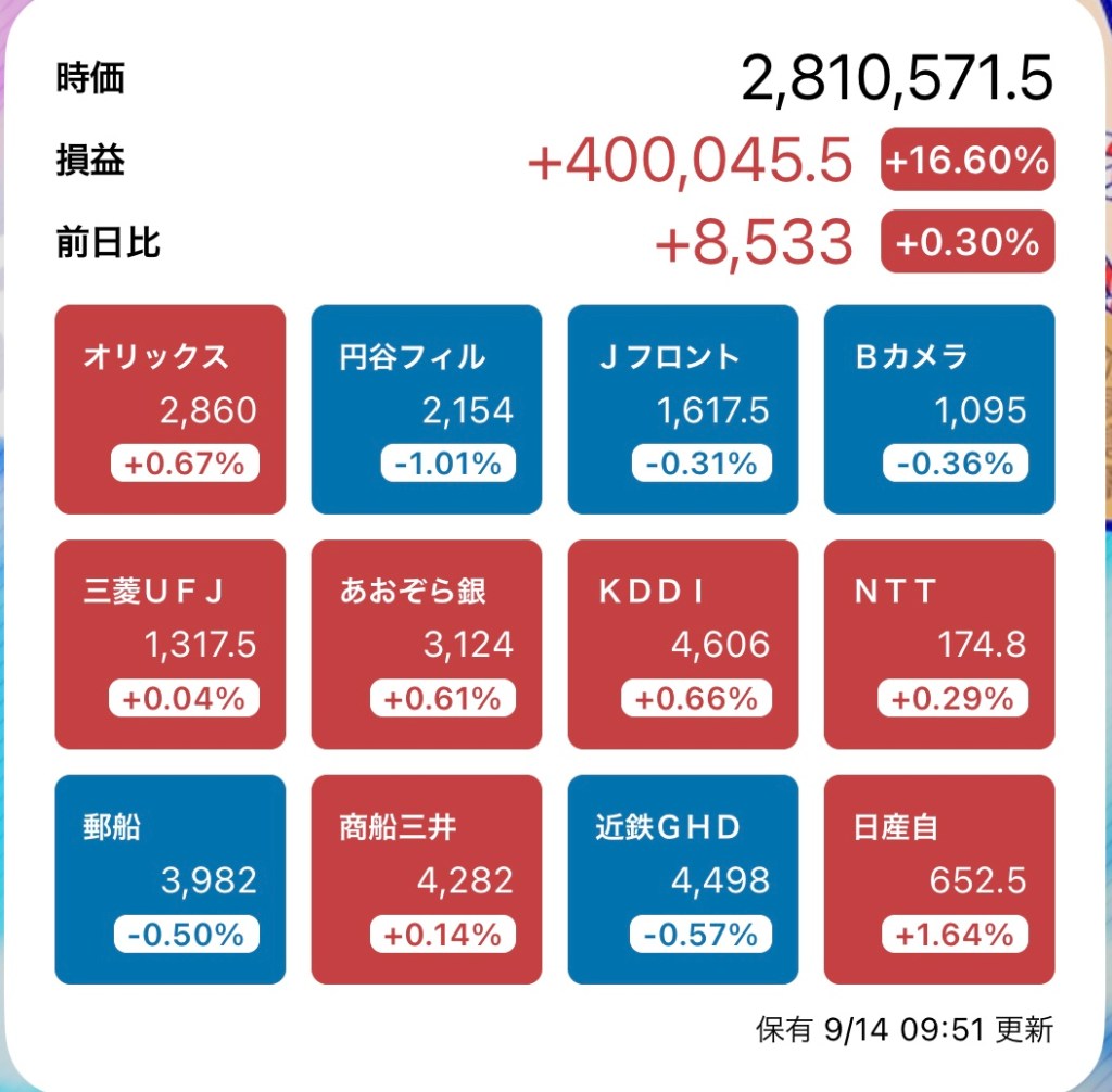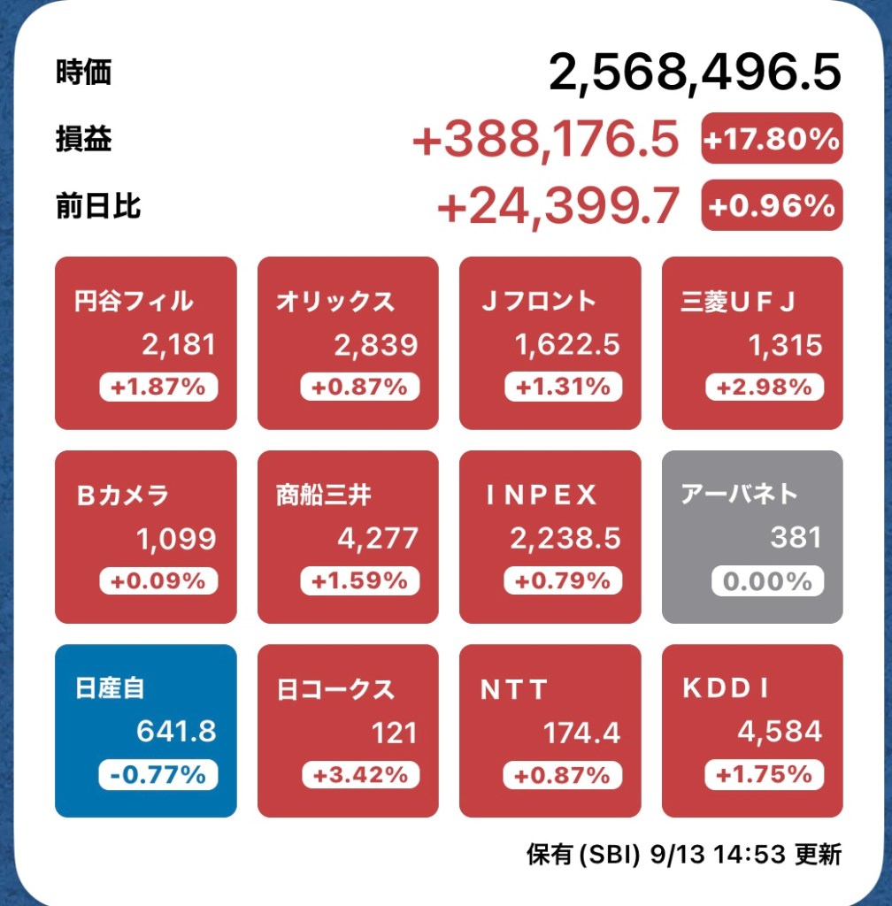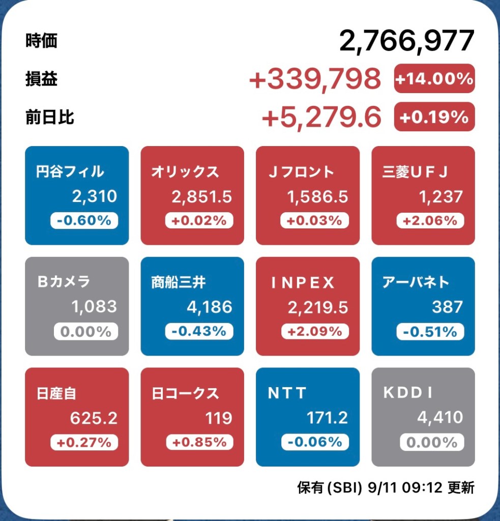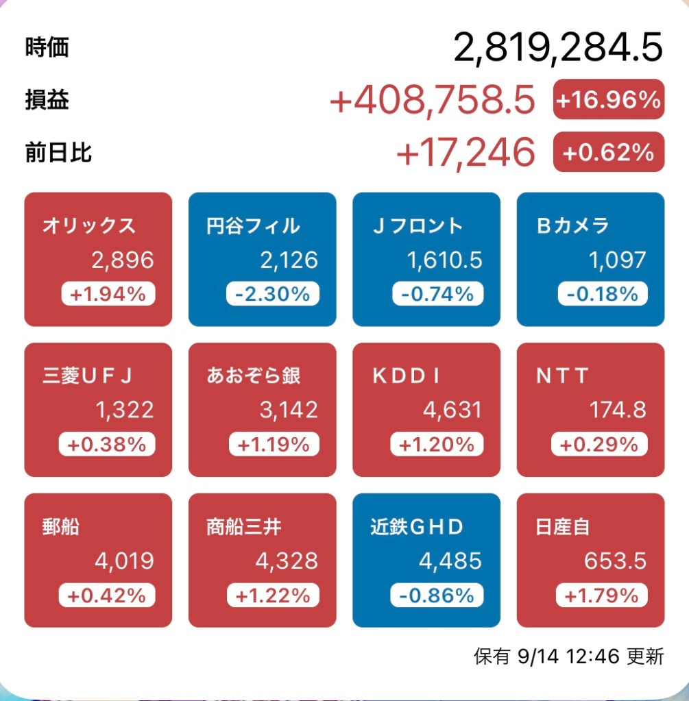 さて、私の方はというと。今日もお休みですが、朝から病院周りです。最初の整形外科行ったときからぐんぐん↑の日経と私のPF…夏枯れ過ぎて、秋のアップが続くのか?!?