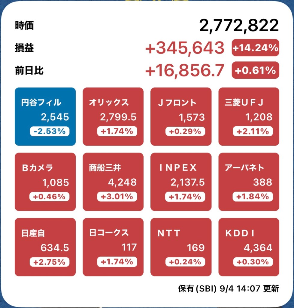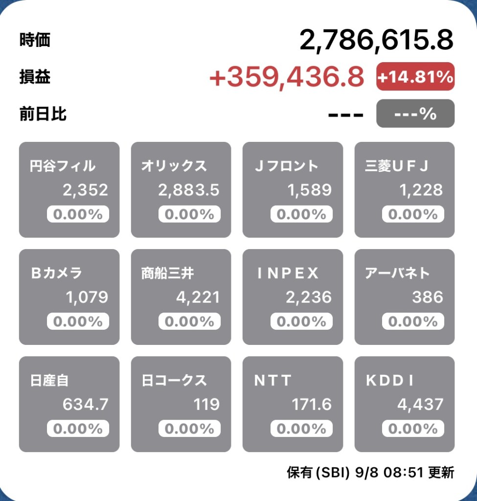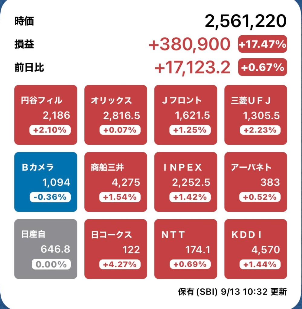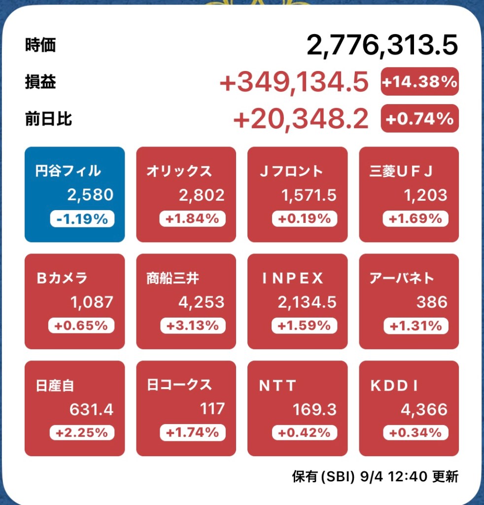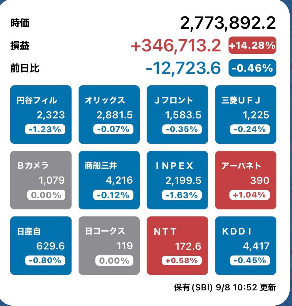さて、私の方はというと。今日もお休みですが、朝から病院周りです。最初の整形外科行ったときからぐんぐん↑の日経と私のPF…夏枯れ過ぎて、秋のアップが続くのか?!?
