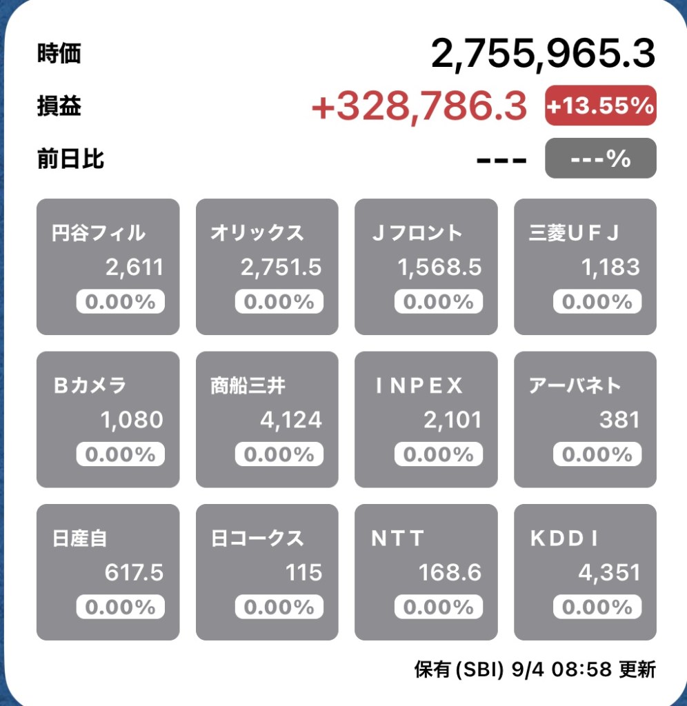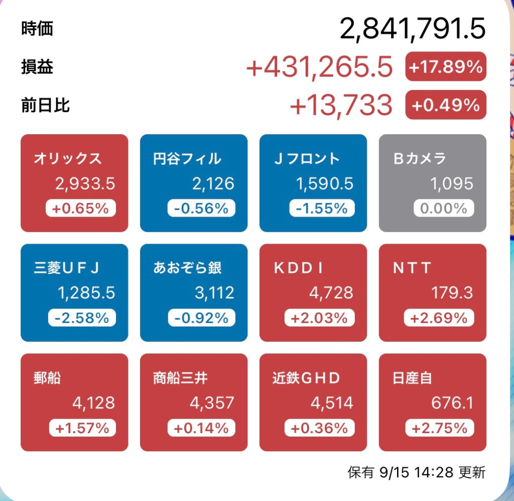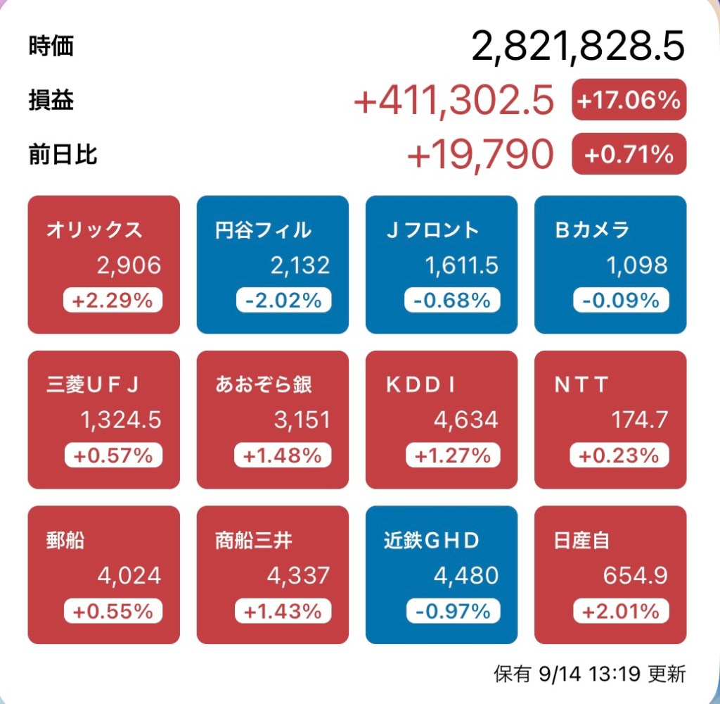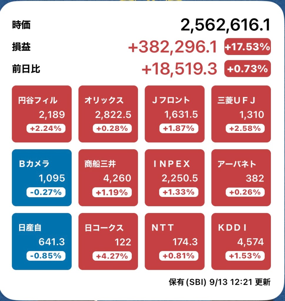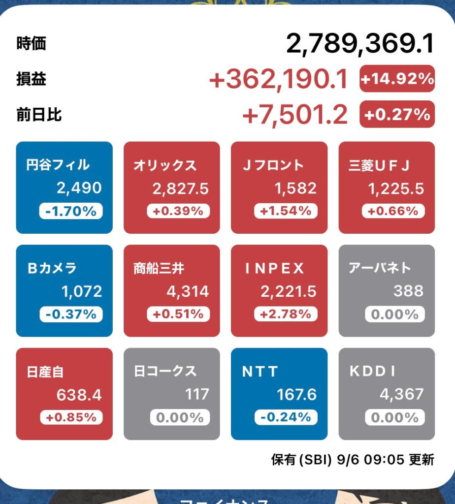 さて、私の方はというと。今日もお休みですが、朝から病院周りです。最初の整形外科行ったときからぐんぐん↑の日経と私のPF…夏枯れ過ぎて、秋のアップが続くのか?!?