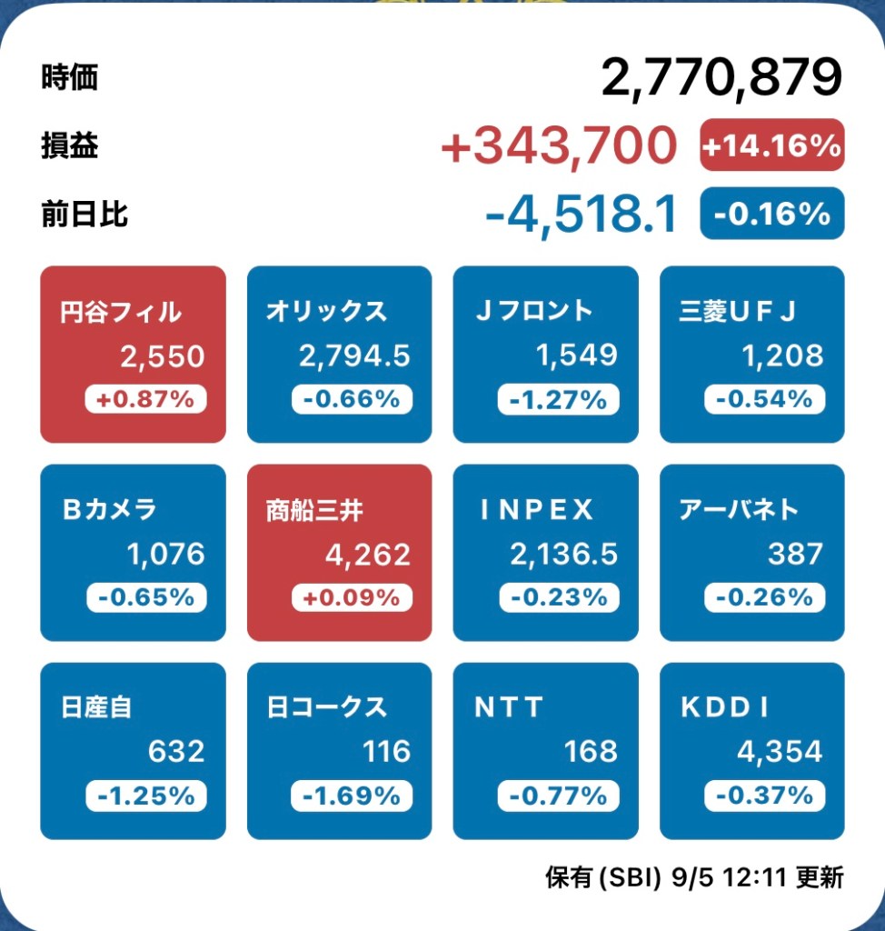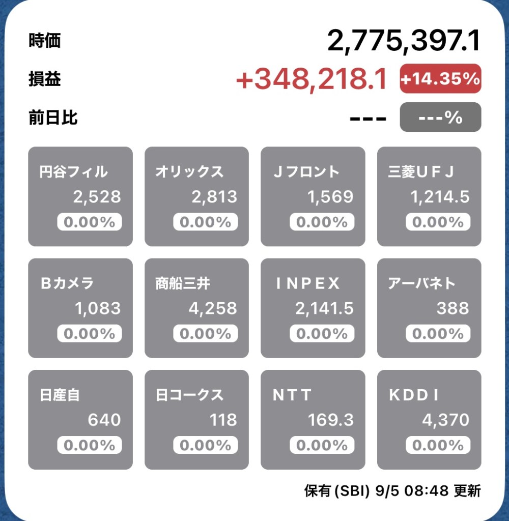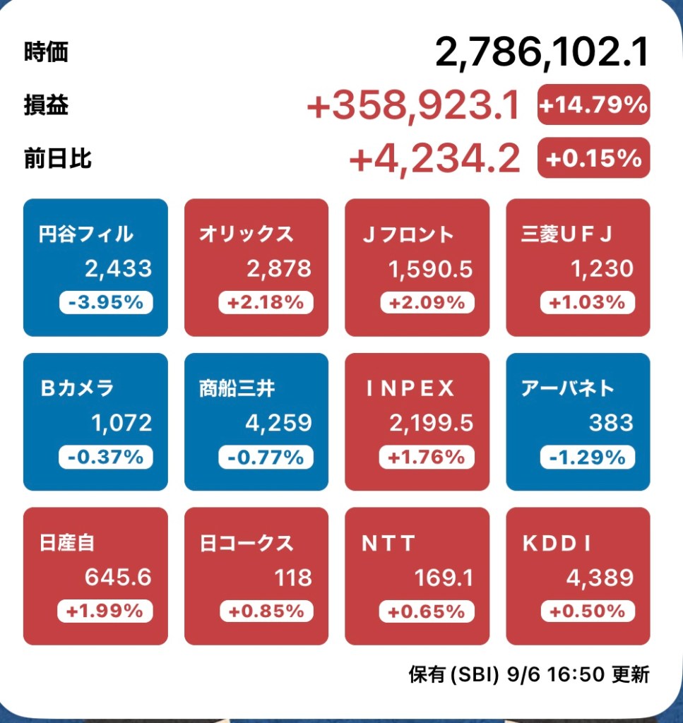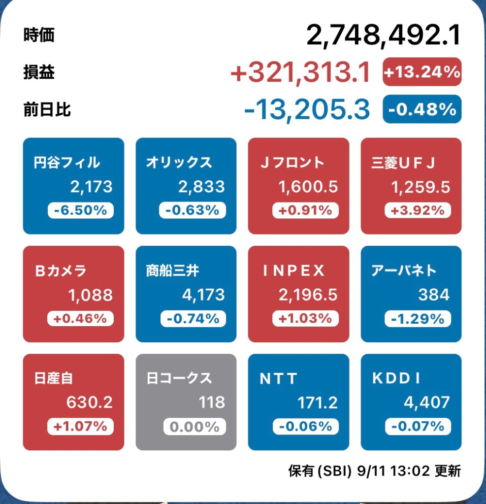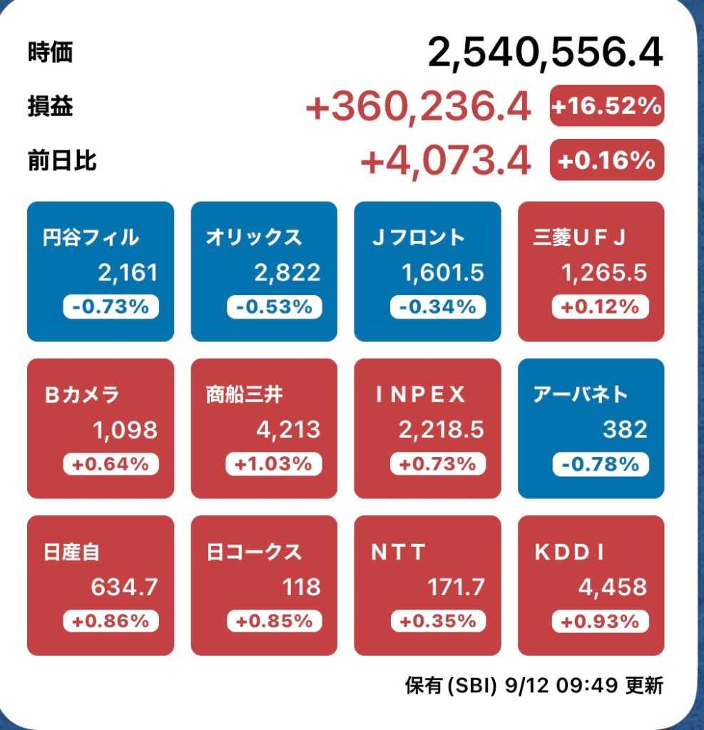 さて、私の方はというと。今日もお休みですが、朝から病院周りです。最初の整形外科行ったときからぐんぐん↑の日経と私のPF…夏枯れ過ぎて、秋のアップが続くのか?!?