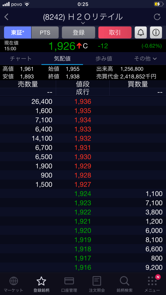 なんて言いつつ、初購入が件のH2Oリテイル!前場11時くらいから上がり始めたので焦って2170で刺しちゃった💦それでも、昨晩PTSで買わなかったのは正解でした。